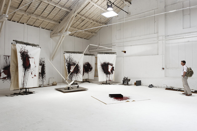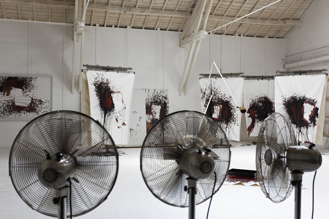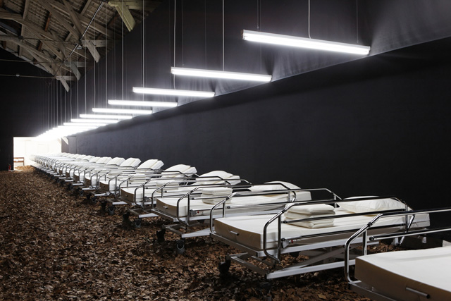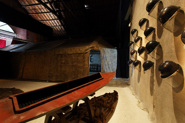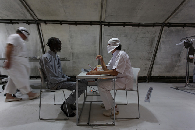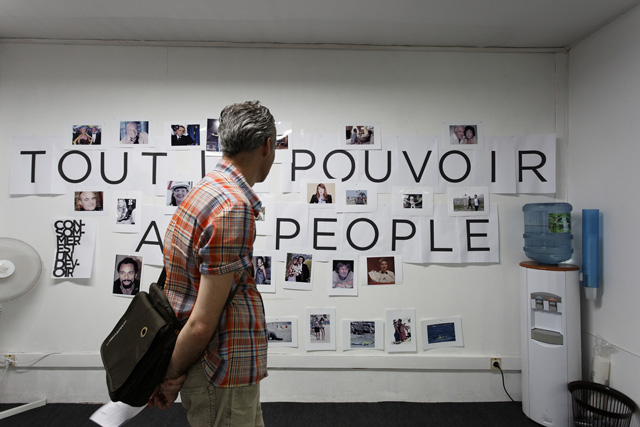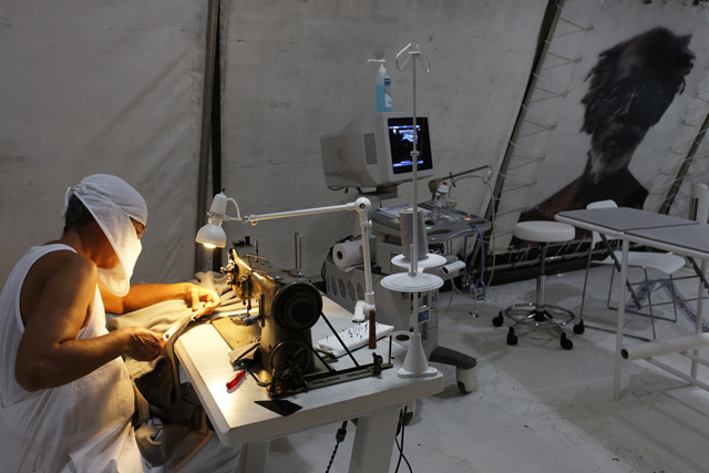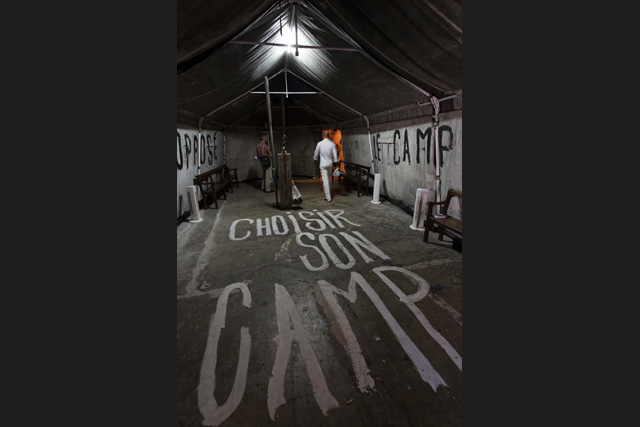 One Man's Prison Yard is food for thinking about, hearing, feeling, listening to and reading the reality of an administrative internment camp, and seeks to create a state of disquiet in every visitor. Is it an exhibition, an installation, a theatre experience, a visit? No matter. It is that and not really that, a little and everything at the same time. It is an occasion for curious encounters; you see what you rarely see in a museum or on a stage. You must stop there, go back there and simply take your time to look. You read slogans, written on the walls, on the banners, on the flags, in large and small letters. You consult a newspaper that is different every day, written, illustrated and laid out during the night. You listen to “quick rounds of the question”, some 30 opinions of experts weighing pro and con based on a fact, an anecdote, an event. Words that only aim at blocking all the outlets of thinking in a game of opposed parties, a reassuring but alienating system that mimics debates, broadcasts and discussions. One question occupies the core of the system: how can the internment camp, that you go through and you smell, that you look at and that looks at you, how can this camp created in the colonial conquest of Algeria still be present and even more present than ever, in the heart of 21st century Europe, reactivated by the ideology of the control and retention of foreigners? This camp, still presented as “exceptional”, has become the norm of an arbitrariness that concerns over 30,000 foreigners, held in 240 administrative internment sites spread over the entire European continent. The brutality developed against the immigrants continues that which the colonialist European powers used against the so-called indigenous populations. As if the administrative internment camp represented today the colonial hold on the present. Issa Samb, living there, in a Miroiterie that has become One Man's Prison yard, gives body and conscience to this wound. ADB