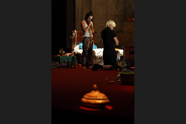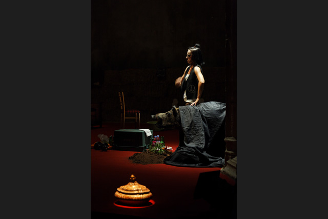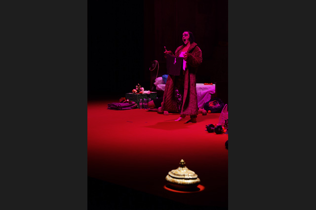 It is a monster that we see and hear in this show. A monster in every meaning of the term. It is first of all a man who takes shape in a woman: inspired by Shakespeare's Richard III, Ricardo is incarnated by Angélica Liddell herself, accompanied by an almost mute Catesby on a stage that is gradually peopled with ghosts. In Ricardo/Richard are concentrated the excesses of power, the abuses of tyranny, the servility of the individual and the baseness of society. And his hunchbacked body is as monstrous as his speech: "I have the teeth of a horse and hoofs as feet!", he tosses out at the beginning of the play. It is a sick body, and moreover, because the pills of all sorts that he clamours for from his faithful Catesby have disaster effects on him: vomiting, vertigo, thirst, bleeding... So he imposes his suffering on the others, spreads the reign of fear around him. He must have a party, regardless of whom, since "the world is no longer divided into ideologies. It is divided into rich and poor." The monster is also the one who questions normality. This insolent despot digs into the wounds and contradictions of democracy. By giving the floor to the representation of power, Angélica Liddell questions us. She inhabits a cynical character who clamours at anyone who will listen that his authority is based on the fear and egoism of everyone. To this ambiguous monster, she lends a body that is sometimes feverish, sometimes helpless, and an exaggerated, deformed, changing voice. And when the frenzy gives way to exhaustion, the horror reappears ever greater, the monster regains strength. CV