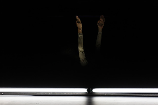 Carried away in a hypnotic ballet of arms, Perrine Valli swirls in front of a carpet of light. A tension is established until she plunges her hands into it and is completely taken up in it. Moving between the neon lights like a nymph in water, offering herself up to space, to light, to the electronic score by Mika Vainio, her body melts into the elements until she is removed from all reality. ADB