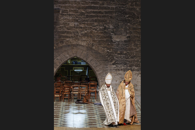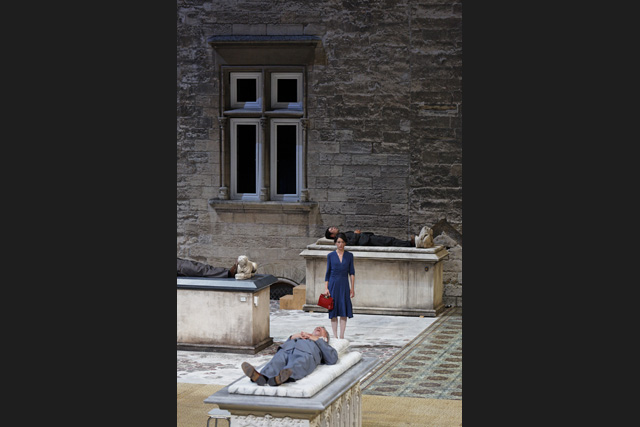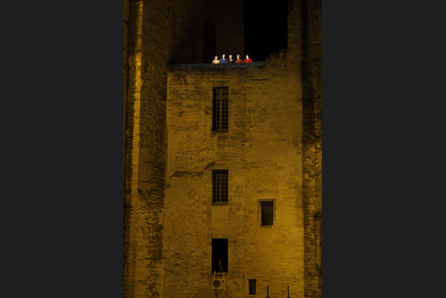 It was a political-religious conflict between the king of France Philippe le Bel and the pope Boniface VIII that gave rise to the history of the Avignon papacy and therefore the history of the Palais des papes and its celebrated Cour d'honneur that Christoph Marthaler, Anna Viebrock and their companions will invest 700 years after the installation of the popes in France. This show created for the Cour will only be presented at the Festival. Curious about this place, curious about its architecture and its past, the director looked for what his musical theatre could express by taking an interest in this labyrinthine palace and those who went through it. Isn't this monument the majestic expression of political power and religious power that, down through the centuries, had in common using at their convenience truth and lies to protect themselves from the obstacles that constantly threatened them and establish over the long term the pre-eminence of one vis-à-vis the other? Questioning the parcelled-out history that books recount to us, adding a few missing, even invented elements, crossing literature, music and philosophy, Christoph Marthaler will cast his poet's eyes on the illusory nature of truth, in this new creation with the enigmatic title, an outmoded German expression, that could be translated as "blah blah blah" or "what next!". From small concrete events in sublime moments of individual or collective imagination, he will compose as usual a score that is as much acted as sung that will genuinely be inscribed in this Courtyard and will perhaps make appear what is hidden behind its monumental and fantastic wall. What was hidden there yesterday, what is still hidden there in 2010, behind its many transparent and stained-glass windows, doors, barred basement openings, in the tombs, true or false, real or theatrical. It is on a voyage between an "elsewhere" and "long ago", a "here and now" that Christoph Marthaler and Anna Viebrock invite us. A voyage between dreams and reality, archaeological research and a police investigation. An artistic voyage meticulously articulated, elegant and full of humour, at the limits of history and the theatre: and if the history of the Palais des papes was only now beginning? JFP