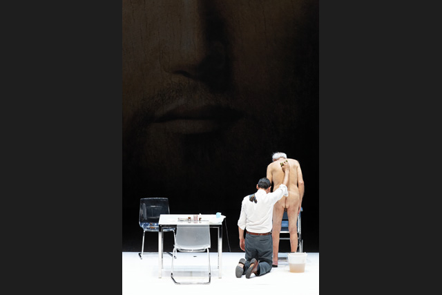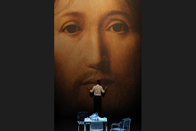 The atmosphere of Sul concetto di volto nel Figlio di Dio recalls that of Purgatory: the same cosy living room, the same slice of ordinary daily life treated as a sequence shot without any framing whatsoever. An old man is glued to his TV, wearing head-phones, and his son, a bachelor, gets ready to leave for work. However, an anomaly has slipped in at the back of the stage: a huge portrait of Christ - an enlargement of Antonello da Messina's Salvator Mundi - whose ardent gaze watches over the scene in the half-light. Gradually, according to the codes of stark realism, the spotless living room becomes the centre of a less and less controllable disorder. In a time that seems to falter, every gesture of the son for the father is felt as a genuine cause that must be embraced, as though he were calling for the support of the whole audience. His patience and his pity, his love and his anger, even his hate as his powerlessness to overcome the crisis is revealed, arouse an empathy mixed with dread. JLP