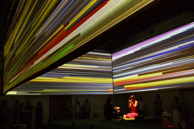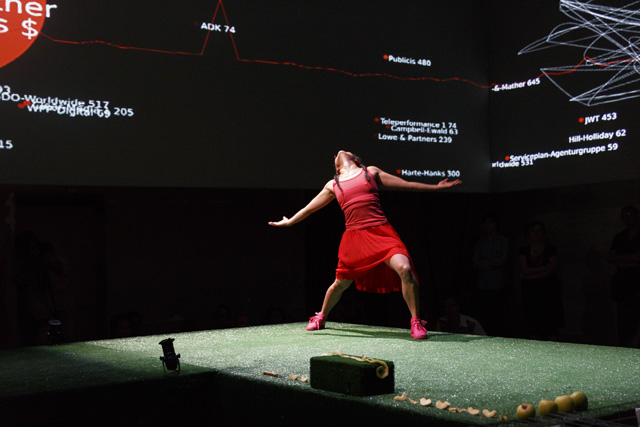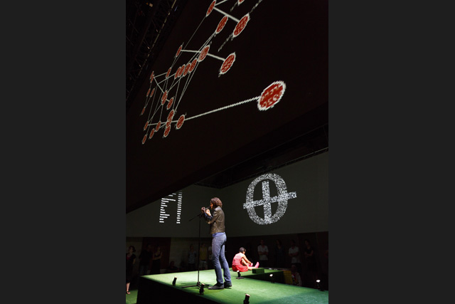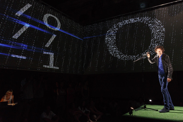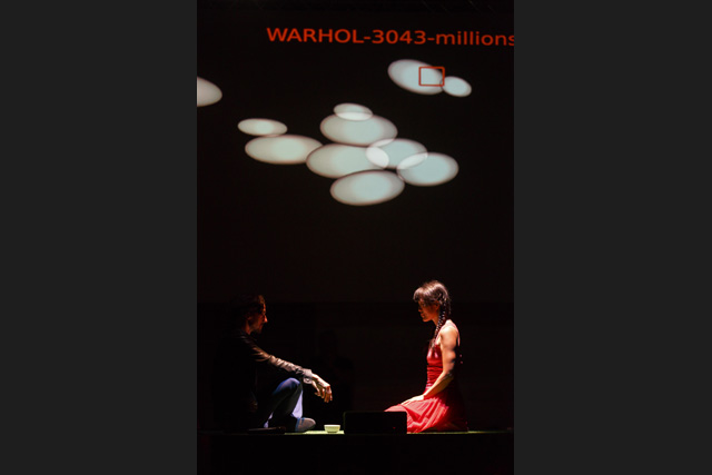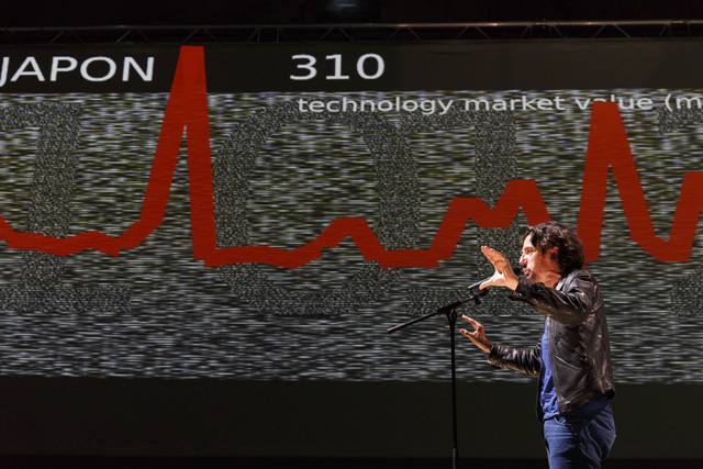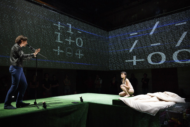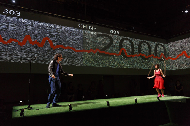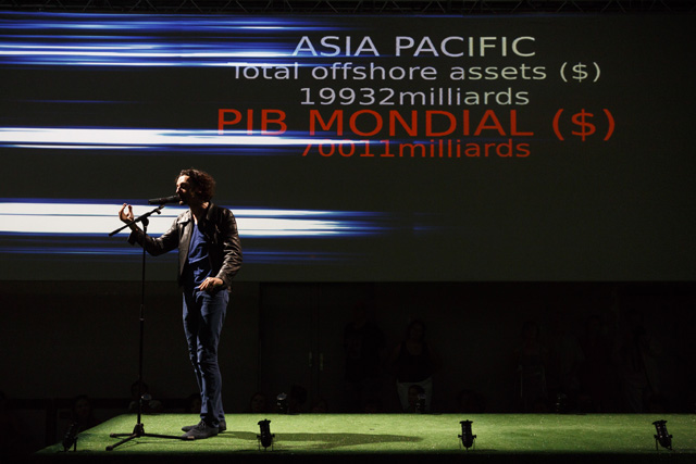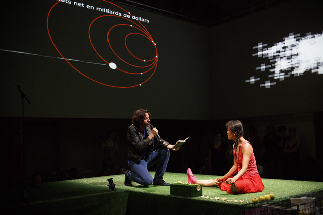 It is unquestionably one of the most frequently used words in the French language in everyday life and, paradoxically, the least present in dramatic texts: money. Unquestionably because its moral value and its concrete value meld to occupy our minds so that there is a tacit acceptance of the dominant role it plays in our existence. The poet Christophe Tarkos was not satisfied with that “keep moving, there's nothing more to see” in composing a text that, with a mischievous finesse, multiplies assertions, formulations and affirmations in an infernal and repetitive spiral studded with humour to, in the end, make us aware of our dependence on this omnipresent money, here as everywhere else in the world. Neither a condemnation nor a denunciation on the part of the author, just the determination to use the power of words to question the obvious that is not that obvious. In taking hold of this text, Anne Théron wanted to both have it heard, have it “seen” and have it felt, using all the means the theatre possesses today to open up the poem and make it even more resonant without betraying it: the interpreters' bodies and voices of course – in this case the actor Stanislas Nordey and the dancer Akiko Hasegawa –, but also sophisticated technological processes. With Christian Van der Borght, she has imagined an environment with totally digit aesthetics in which the interpreters, as well as the spectators, are plunged, experiencing the flow of data that submerges us daily, more or less consciously, money being to a great extent dematerialized. An immersive proposal in which the theatre is also permanence, music and dance, since Christophe Tarkos' poetry is an affair of rhythm and movement. JFP
