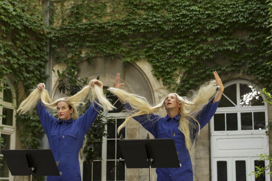 Synchronised narrating, a topic that drives them up the wall. After the wreck, they talk by the fire about film music through the body, about disciplines to break, about blurred boundaries, about boy-toys and women-walls to tear down, about the possibility to alter voices, about tragi-comic cheese, about costume design and hairdryers. Where's the dancer? Where's the singer? There's some bickering to figure out who'll play the leading role and in the end everyone agrees: there's no need for the artist to identify herself.