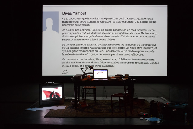 Comment percer le mystère d'un suicide ? Quand le suicidé est une personnalité publique, un militant des droits de l'homme, assurant dans une lettre posthume n'avoir aucun problème affectif, familial ou social, l'acte déclenche bien sûr de multiples interrogations. L'irrévocable décision de Diyaa Yamout a donc électrisé la société libanaise. Personnalités politiques ou religieuses, amis, connaissances et anonymes, jeunes et moins jeunes, de gauche comme de droite, ont réagi à cet acte personnel devenu véritable débat de société, démultiplié par l'utilisation des réseaux sociaux. C'est à partir des objets qui participaient au quotidien de ce jeune homme – téléphone, répondeur, poste de télévision et ordinateur – qui continuent à vivre, à fonctionner et à communiquer, que se racontera non seulement ce geste terrible, mais surtout ce qu'il est advenu au Liban, après sa réalisation. Des tentatives multiples de récupération aux expressions diverses de désespoir, de la volonté d'optimiser cette tragédie à la conscience aiguë d'un impossible avenir, toutes les opinions se sont exprimées dans les jours qui ont suivi ce suicide. Il faut donc les faire entendre pour questionner les impasses dans lesquelles se retrouve une société morcelée, divisée, quasi paralysée : cette société libanaise qui reste au cœur des propositions théâtrales de Lina Saneh et Rabih Mroué. JFP