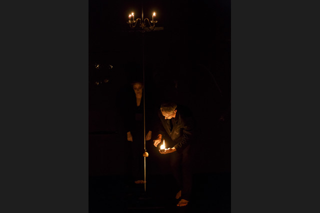 Transformer l'exiguïté d'une boîte de quatre mètres sur trois en un espace infini, abolir le temps autour d'un simple bâton, qui contraint autant qu'il rend possible la relation de deux êtres : voilà l'expérience théâtrale et alchimique à laquelle se livrent Josef Nadj et Anne-Sophie Lancelin. Ensemble, ils habitent ce dispositif et dansent pour une soixantaine de spectateurs. La promiscuité se change en intimité, le public est attentif aux innombrables détails d'une scène éclairée par de simples bougies. Le tableau vacille et évolue sous les assauts du souffle de chacun. Souffle, en allemand, se dit Atem. C'est un mot que Josef Nadj a rencontré dans un poème de Paul Celan, dont les écrits gravitent autour de cette nouvelle création. Le tableau vacille et évolue également sous les assauts d'Albrecht Dürer (1471-1528), dont la gravure Melencolia subjugue et poursuit Josef Nadj depuis son adolescence. Il y voit une femme et un petit homme, dotés d'ailes, qui semblent attendre devant une maison, entourés de multiples signes et objets qui rendent infinies les interprétations possibles. Le chorégraphe s'empare de cette gravure et de celles qui composent avec elle une trilogie – Saint Jérôme dans sa cellule et Le Chevalier, le Diable et la Mort –, comme d'un gisement de rébus, de suggestions. Afin de déplier tous les possibles contenus dans ces œuvres, Anne-Sophie Lancelin et Josef Nadj évoluent dans un espace sonore composé, par Alain Mahé, à partir du son de la nature et des éléments. Pour un petit théâtre d'ombre et de lumière, d'émotions et de sensations. RB