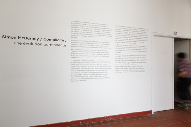 Cette exposition offre un bref aperçu du travail de la compagnie, et plonge le visiteur dans son processus de création. Elle montre comment et avec quels outils Simon McBurney et Complicite envisagent la fabrique du théâtre.