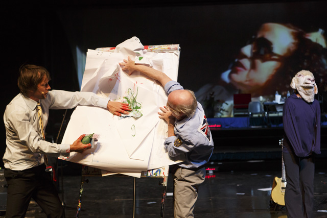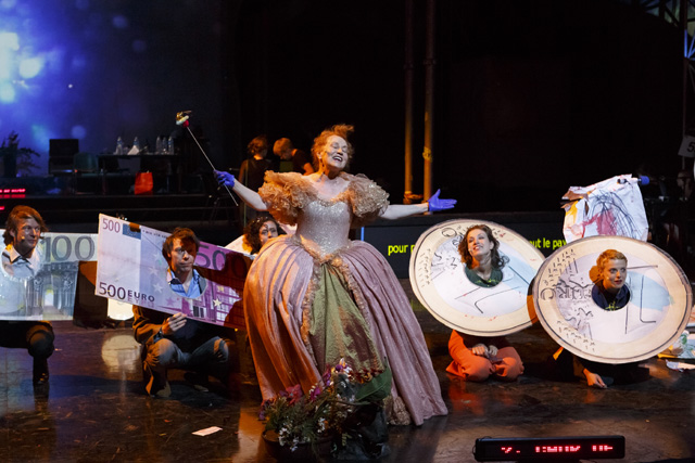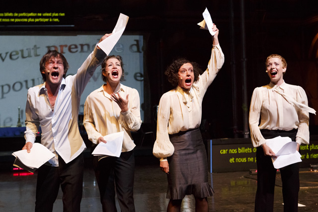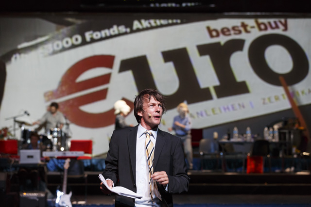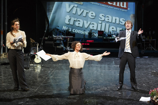 Écrite quelques mois avant que la crise des subprimes n'éclate au grand jour, Die Kontrakte des Kaufmanns apparaît aujourd'hui plus que jamais comme la prémonition de toutes celles qui lui ont succédé. La plume acérée d'Elfriede Jelinek s'attaque aux gros et petits spéculateurs des marchés financiers, à même le langage dont ils se parent. Avec une implacable lucidité et un humour féroce, elle joue inlassablement avec leurs discours prétendument rationnels, pour en donner à entendre le jargon aussi irréel que farcesque. Leurs effets n'en apparaissent que plus tragiques. Comme elle le dit, Elfriede Jelinek n'écrit pas tant des pièces que des « textes à parler », une langue vivante chargée de l'urgence de dire, qui a besoin des corps et de l'énergie du plateau du théâtre pour se réaliser. La vitalité communicative avec laquelle Nicolas Stemann et ses partenaires s'en emparent et nous l'adressent est à la démesure de cette matière foisonnante. Acteurs, musiciens, techniciens, vidéastes, dramaturge, metteur en scène, tous présents sur la scène, fabriquent ensemble, à vue et en temps réel, une machine théâtrale exubérante en constant devenir, qui tient autant de la lecture, du concert, de la performance, du chœur antique, du show télévisé que de l'assemblée d'actionnaires. Au propre comme au figuré, les portes de ce théâtre aux allures de cabaret sont grandes ouvertes sur l'imprévisible réalité dont il s'alimente et qu'il transforme en retour. Si ses artisans, tout comme les genres de représentations et les langages artistiques, y circulent, s'y croisent, prolifèrent librement jusqu'à déborder du plateau, les spectateurs eux-mêmes sont invités à entrer et sortir de la salle à leur guise. Dans cette représentation, pour aussi spectaculaire qu'elle soit, c'est d'abord le présent qui prime. L'évidence de l'être ensemble s'oppose, de fait, à l'opacité d'un système où la peur, l'avidité et le cynisme semblent régner en maîtres. Une satire à l'ironie salutaire, d'autant plus corrosive qu'elle est portée par une vigueur quasiment dionysiaque. SC