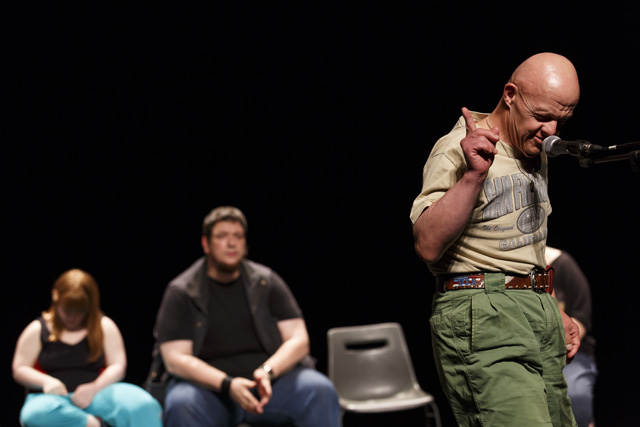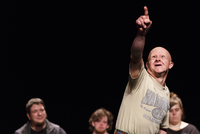 Âgés de 18 à 51 ans, les acteurs du Theater HORA sont pour la plupart atteints du syndrome de Down, plus couramment appelé trisomie 21. Acteurs avertis, ils présentent à travers l'Europe des pièces d'après Shakespeare, Conrad ou Fellini. C'est parce qu'ils sont professionnels que Jérôme Bel a accepté de travailler avec eux. Pourtant, pas question de leur faire endosser des rôles : sur le plateau nu, ils n'interprètent rien d'autre qu'eux-mêmes. Tout comme l'ont fait avant eux, sous la direction du même metteur en scène, Véronique Doisneau ou Cédric Andrieux, respectivement anciens danseurs de l'Opéra de Paris et de la compagnie Merce Cunningham. Disabled Theater met en lumière leur handicap autant qu'il le banalise, interrogeant les frontières que nous traçons entre normalité et anormalité. Le spectacle raconte la rencontre et la relation de travail entre Jérôme Bel et les acteurs du Theater HORA. Ces derniers réagissent, de façon libre et subjective, à une série de propositions formulées en suisse allemand par une interprète présente sur le plateau, qui traduit ensuite leurs réponses. Leur présence est aussi intense que troublante : incapables de dissimulation, ils mettent en crise notre compréhension de l'autre et nos repères théâtraux. Leurs corps et leurs gestes singuliers, leur rapport décalé au temps, leurs failles et leur sensibilité nous révèlent, par un effet de miroir, nos propres faiblesses et fragilités. Disabled Theater crée un espace de visibilité pour une minorité privée de considération dans une société avant tout gouvernée par la compétitivité. Convoquer sur scène ces représentants d'une altérité souvent dévalorisée, pour enrichir le théâtre contemporain et rejoindre ainsi la communauté : voilà le pari de Jérôme Bel. RB
