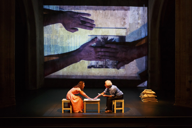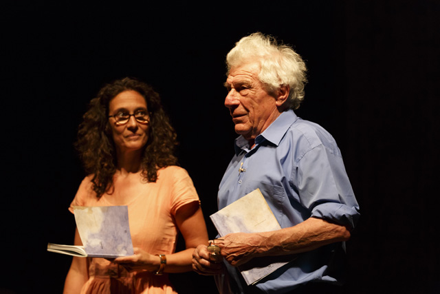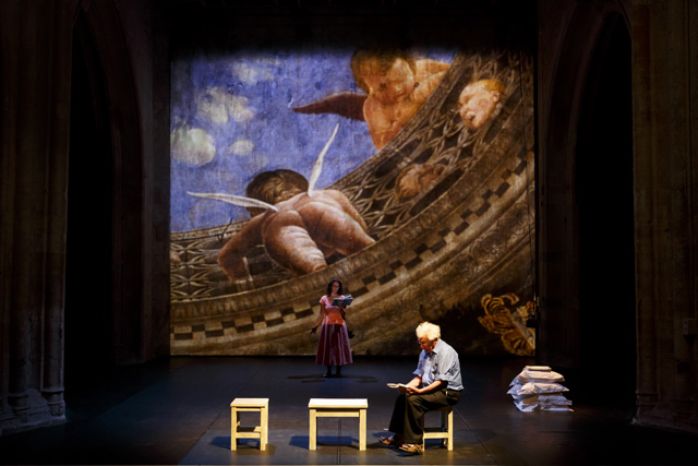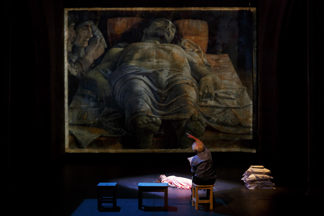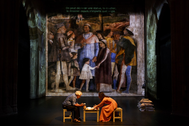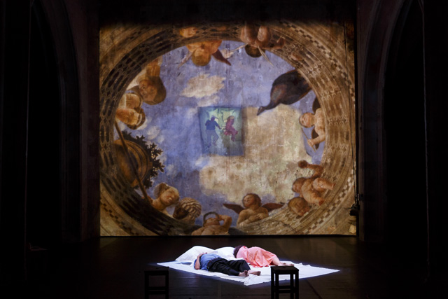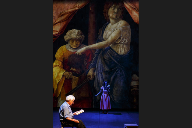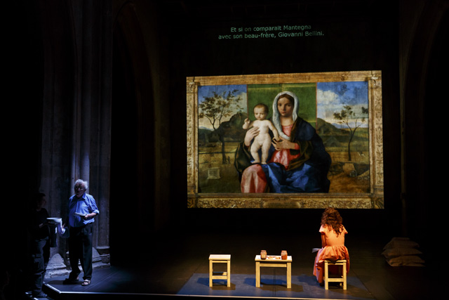 Neuf années ont été nécessaires à Andrea Mantegna pour orner les murs et le plafond d'une petite pièce du palais ducal de Mantoue. Appelé à tort «la chambre des époux», alors qu'il s'agissait vraisemblablement d'un bureau privé muni d'un lit, ce lieu merveilleux, pour lequel le peintre de la Renaissance italienne a laissé libre cours à son imagination, a été visité à plusieurs reprises par John et Katya Berger. Fascinés par cette œuvre atypique, ils ont entrepris un échange par correspondance à son sujet. Ces lettres et SMS deviennent aujourd'hui des dialogues, par recomposition, réécriture ou redistribution des propos échangés. Pris en charge sur le plateau par leurs auteurs, ils sont matière à dire la beauté de la peinture de Mantegna, mais aussi la force d'une relation humaine hors normes et la grâce d'un questionnement sur le regard. Pas de conférence savante, pas de didactisme, pour mettre à la portée du public une œuvre que chacun se doit d'interpréter individuellement. Juste une conversation ouverte, généreuse, animée d'une curiosité qui semble sans limites et témoigne d'un profond désir de partage. Une lecture-performance comme une proposition de relation : à l'art, au monde, au temps, à l'oubli mais surtout, peut-être, de père à fille, et de fille à père. JFP
