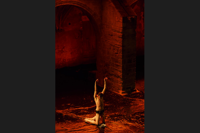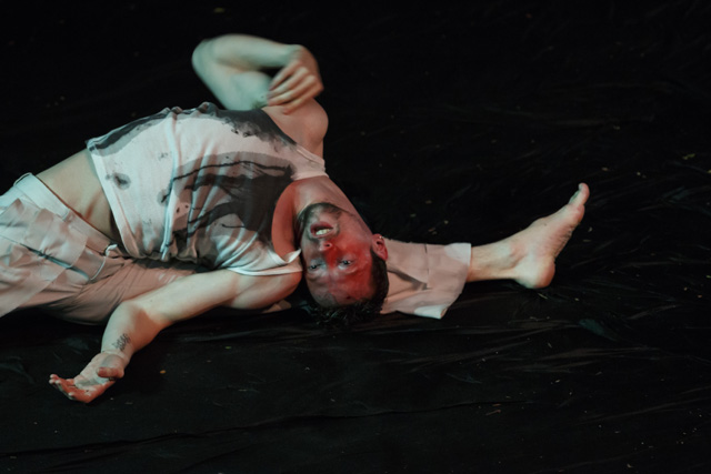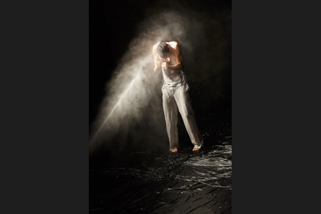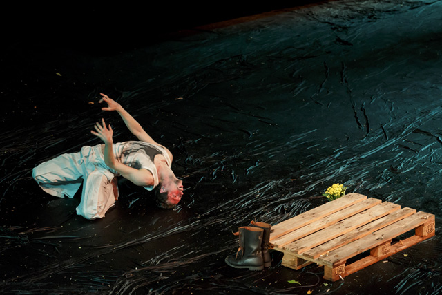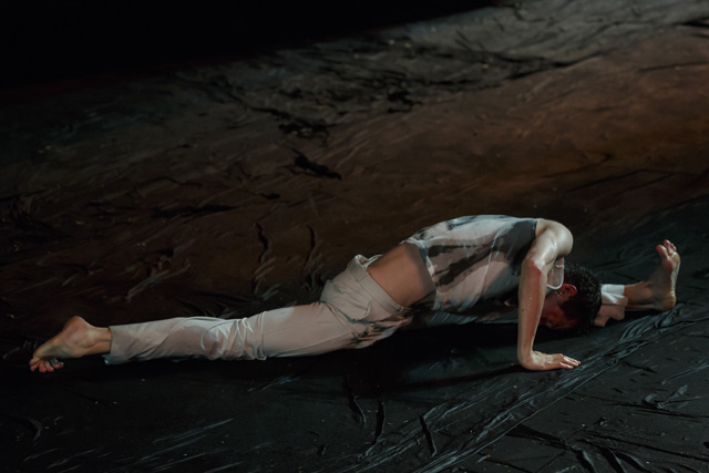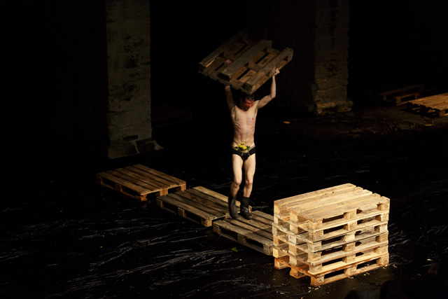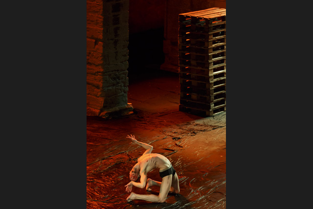 Un homme fume, seul, un livre posé sur les genoux. Cette image du photographe portugais Daniel Blaufucks irrigue la pièce de Romeu Runa et Miguel Moreira, à laquelle elle donne aussi son titre, The Old King. L'intériorité de ce personnage déprimé, errant dans ses pensées, se déploie dans un décor qui évoque un chaos de début ou bien de fin du monde. Avec des allures de reptile, le danseur Romeu Runa tente de s'extraire du cloaque : il se tord, puis se déplie pour retrouver posture humaine. Il arpente en rampant un espace vaste et désolé où ne subsistent que quelques palettes de bois et une plante. Face aux assauts des éléments, il se redresse et, dans l'adversité, finit par se tenir droit. Car The Old King trace le chemin d'un homme qui s'accroche à son humanité perdue, ou en tout cas mise à mal par la solitude. La route d'un individu reclus dans son animalité, dont il s'éloigne en redécouvrant ses souvenirs et en reformulant une vision, un avenir. Sous son impulsion, le paysage change de couleur et de consistance, comme un magma que son seul habitant subit et façonne. Dans un corps à corps sensuel et défiant avec la terre se dessine une peinture abstraite, dans laquelle Romeu Runa développe une danse expressionniste, incarnant et projetant les tourments comme les espoirs de ce roi fou qui reconquiert un empire. Pour écrire ce poème en prose chorégraphique, où la syntaxe compte plus que les rimes, Miguel Moreira l'a encouragé à pousser le plus loin possible son langage, à ne rien retenir des dislocations et contorsions qui caractérisent son style. Alain Platel a joué le rôle d'œil extérieur, critique et bienveillant, apportant son sens du rythme et de la composition aux deux artistes portugais. Ensemble, ils livrent une pièce puissante, où la matière et le corps du roi dessinent une peinture abstraite en perpétuel mouvement. RB