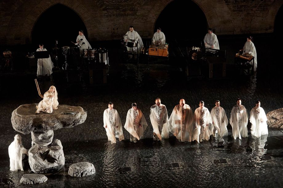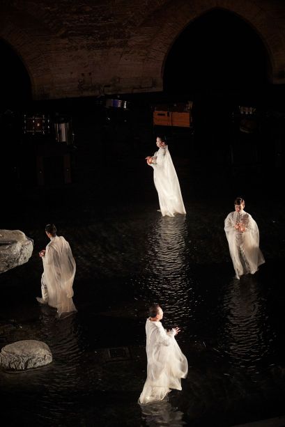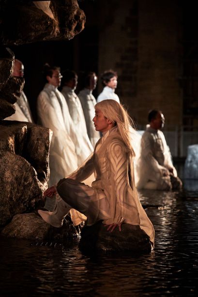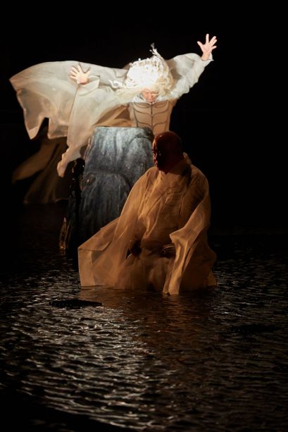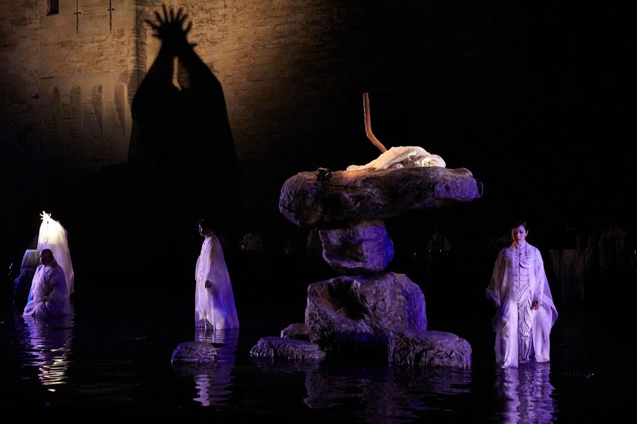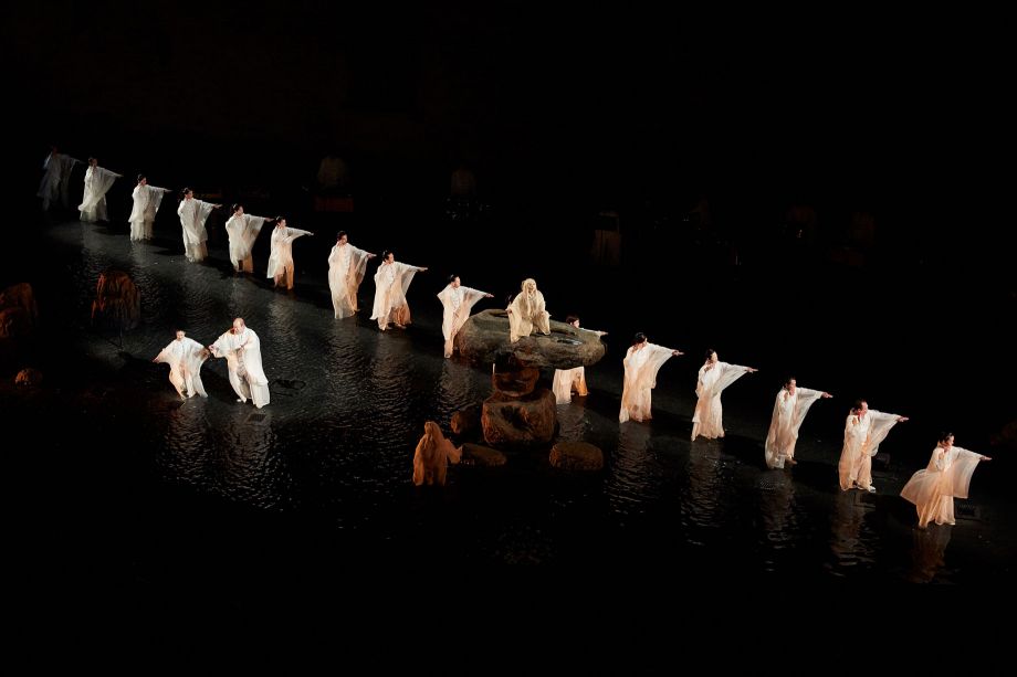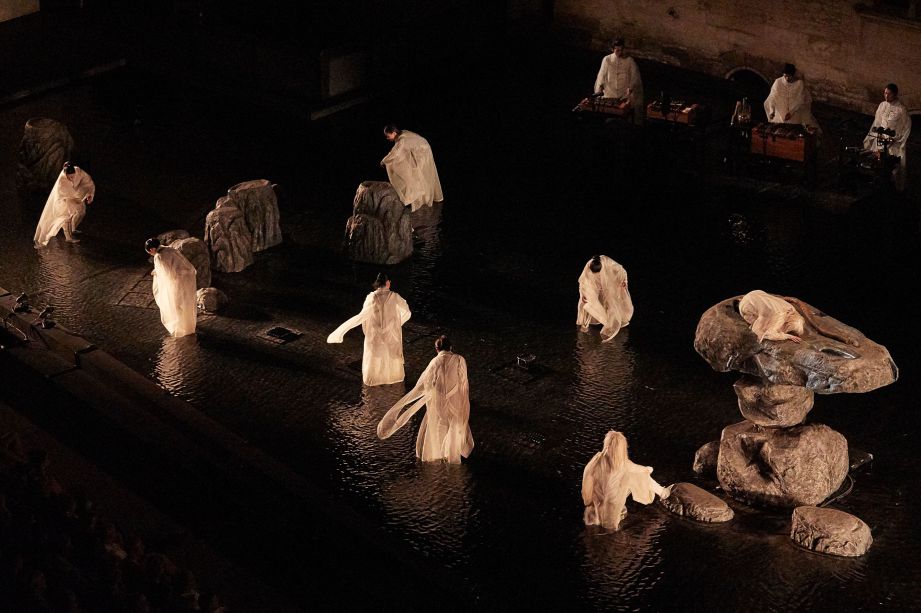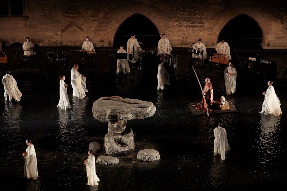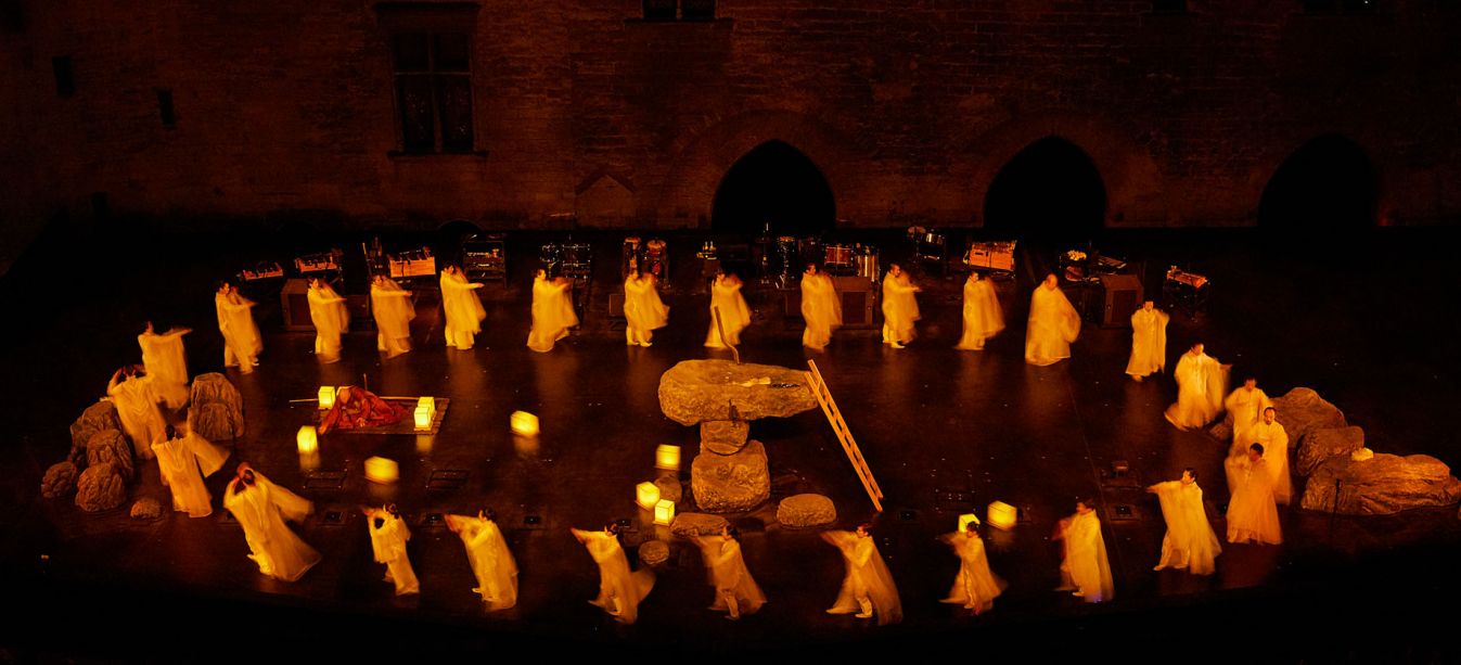 Etéocle et Polynice, fils d'Œdipe et de Jocaste, frères d'Ismène et d'Antigone, ont combattu l'un contre l'autre et ont péri sous un coup réciproque. Thèbes, que défendait Etéocle de l'assaut de son frère, est dirigée par Créon, frère de Jocaste. Le tyran, dès l'annonce de leur mort, promulgue une loi pour distinguer les frères, « le bon et le méchant » : interdiction est faite à tous les citoyens de rendre à Polynice les hommages funèbres. Sophocle, le plus psychologue des poètes antiques grecs parvenus jusqu'à nous, déploie le destin d'une soeur, Antigone, et sa détermination à rendre à ses deux frères les honneurs qu'elle leur doit. Promise à Hémon, fils de Créon, elle brave l'injustice humaine pour suivre la loi des dieux et son amour égal pour tous ceux de son sang. Elle enterrera son frère, dût-elle mourir ensuite. Satoshi Miyagi, fin connaisseur de la tragédie, explore plus avant cette partition stricte que l'Occident opère entre « bons » et « mauvais ». De la Cour d'honneur du Palais des papes, symbole d'une autorité qui aime à séparer mais aussi lieu où le mur est une surface qui dompte les égos, le metteur en scène a souhaité travailler l'eau, les flammes et les ombres pour célébrer la vraie nature de tous les personnages : double ou multiple au sein d'une histoire que l'on pourrait qualifier d'archaïque.