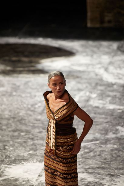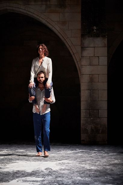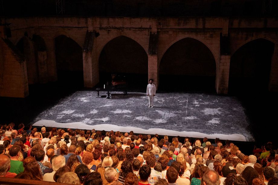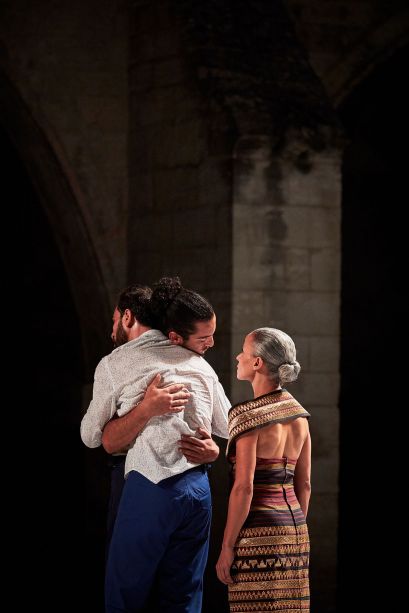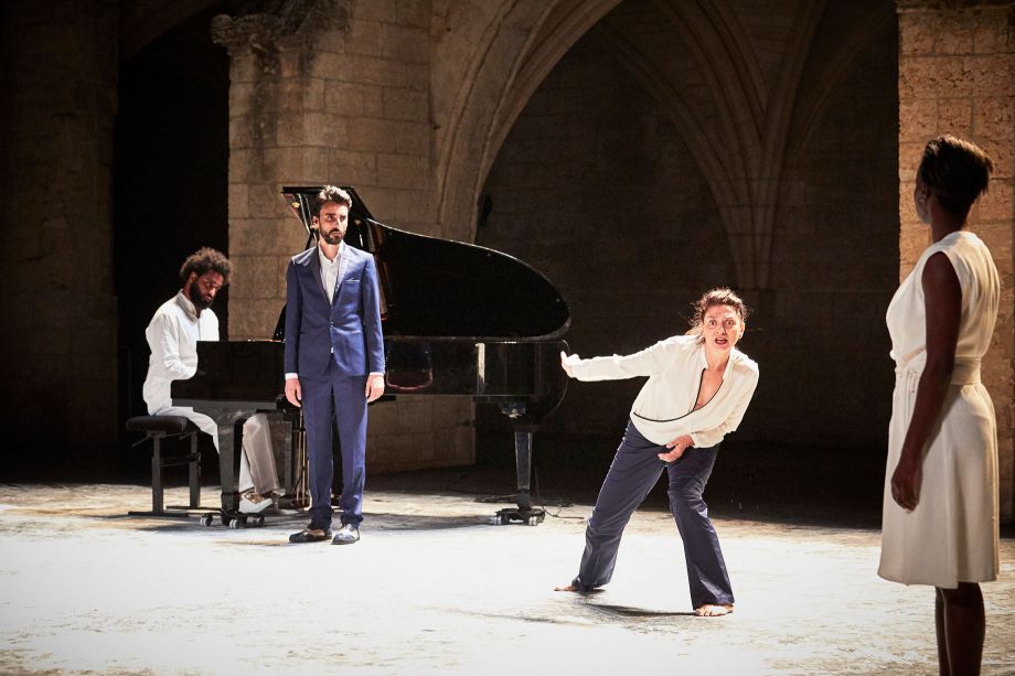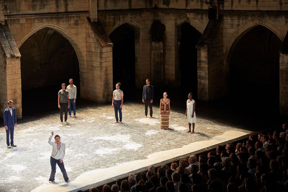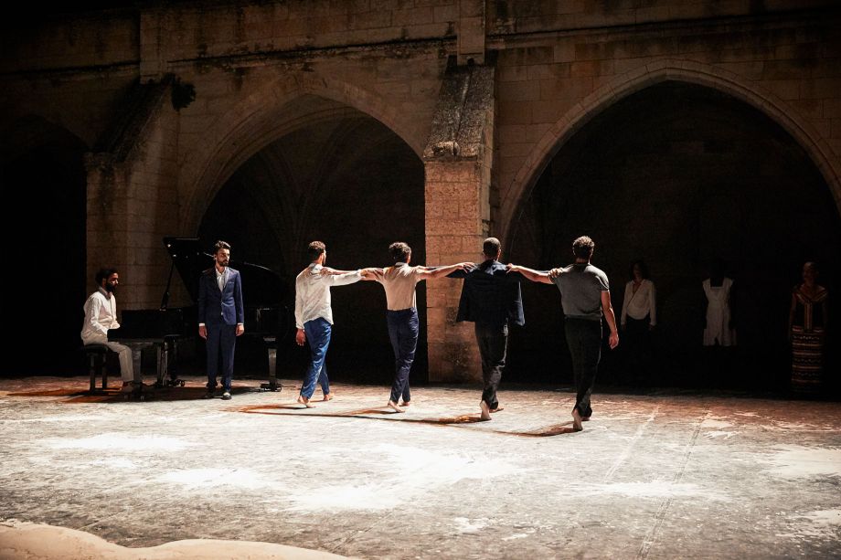 Des hommes, des femmes tournés vers la mer. Ils regardent, s'adressent à cet espace à la fois réel et fictionnel, à cette culture du littoral qui du Liban ou de la Tunisie placent les êtres face à une immensité que l'on fête, accable ou rêve... La mer que l'on contemple, ce sont aussi ces rangées de spectateurs à qui l'on s'adresse mais que l'on ne voit plus. Face à la mer, pour que les larmes deviennent des éclats de rire est l'histoire d'un homme, d'un Tunisien mais aussi français qui raconte une identité multiple. C'est la décision de Radhouane El Meddeb d'aller créer en Tunisie, de rejoindre ceux qui ont participé à la révolution, mais ceux aussi qui regardent avec méfiance celui qui a abandonné le pays natal. Revenir, dire son tumulte émotionnel, danser sa colère face à un pays qui laisse les classes pauvres aller vers les extrémistes, c'est le chemin que le chorégraphe assume. En révélant une vision de la Tunisie moderne en prise avec une histoire ambiguë, la pièce dit le deuil personnel mais aussi universel. Dans l'espace presque vide du plateau, la présence du texte et de la musique racontent l'échappatoire qu'offre l'eau. Que ce soit après une journée de travail, avant de prendre une décision, cette immensité reste toujours le lieu que l'on contemple, auquel on s'adresse et auquel on livre soucis, incertitudes et rêves de politique et d'absolu.