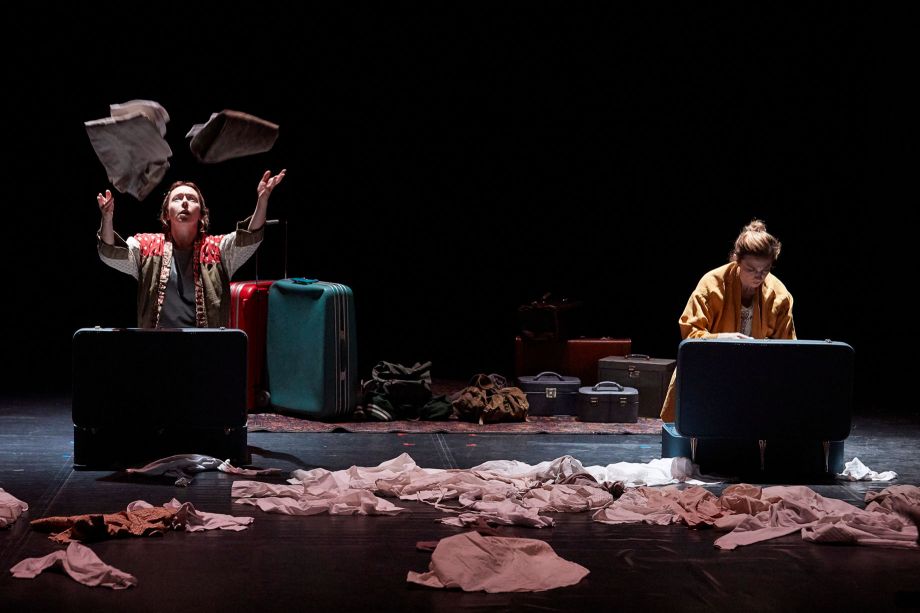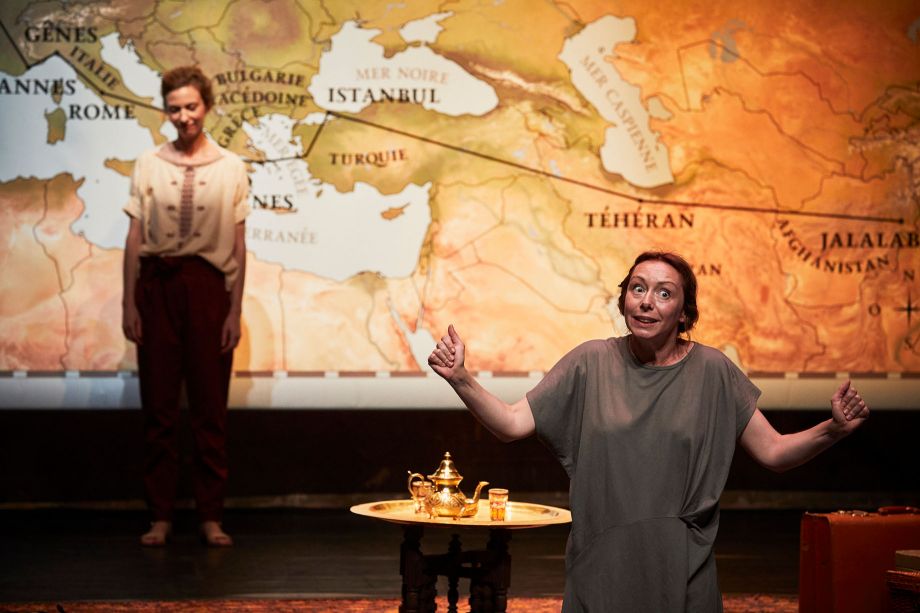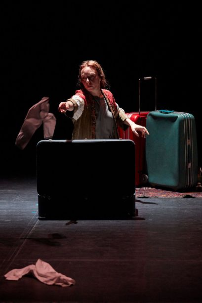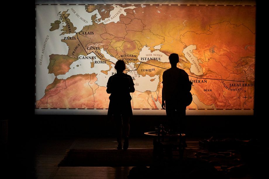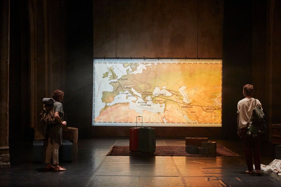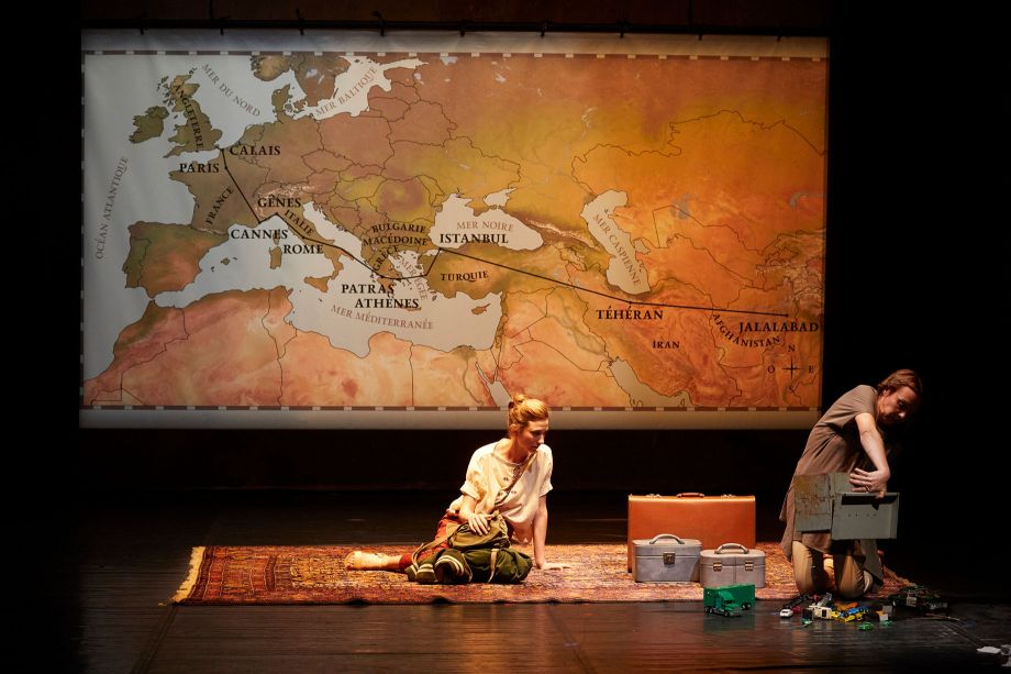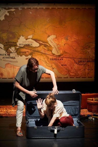 Deux comédiennes assises sur un long tapis déplié devant une grande carte du monde nous attendent. à la manière d'un conte, elles nous disent l'histoire de Farid, un jeune garçon afghan, et nous emmènent dans un voyage initiatique d'une sombre actualité. Au-delà de la forêt, le monde parle, à travers le regard d'un enfant, de la crise des réfugiés en Europe. Des valises inondent le plateau, accompagnent les étapes et, à chaque arrêt, s'ouvrent tantôt sur des mondes nouveaux, tantôt sur des figures familiales réconfortantes. De la fiction à la réalité, le temps des personnages côtoie celui des spectateurs et le récit se met en suspens pour assimiler la brutalité des situations. Face à nous, les comédiennes s'interrogent sur la condition de la femme en Afghanistan, le rôle du théâtre et du citoyen et comment, dans chaque pays d'Europe, repenser ce conte pour enfants... C'est un voyage courageux, vers l'inconnu, inquiétant par moments, à l'issue incertaine, mais accompagné de la douceur du souvenir familial