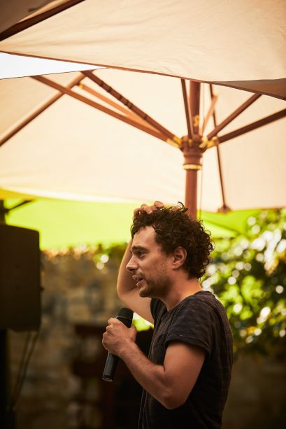 Dans l'écrin enchanteur du jardin de la rue de Mons, dix jeunes comédiens répètent en public et en musique l'adaptation radiophonique de La Chute de la maison, pièce mise en scène par Samuel Achache et Jeanne Candel dans le cadre des Talents Adami Paroles d'acteurs.